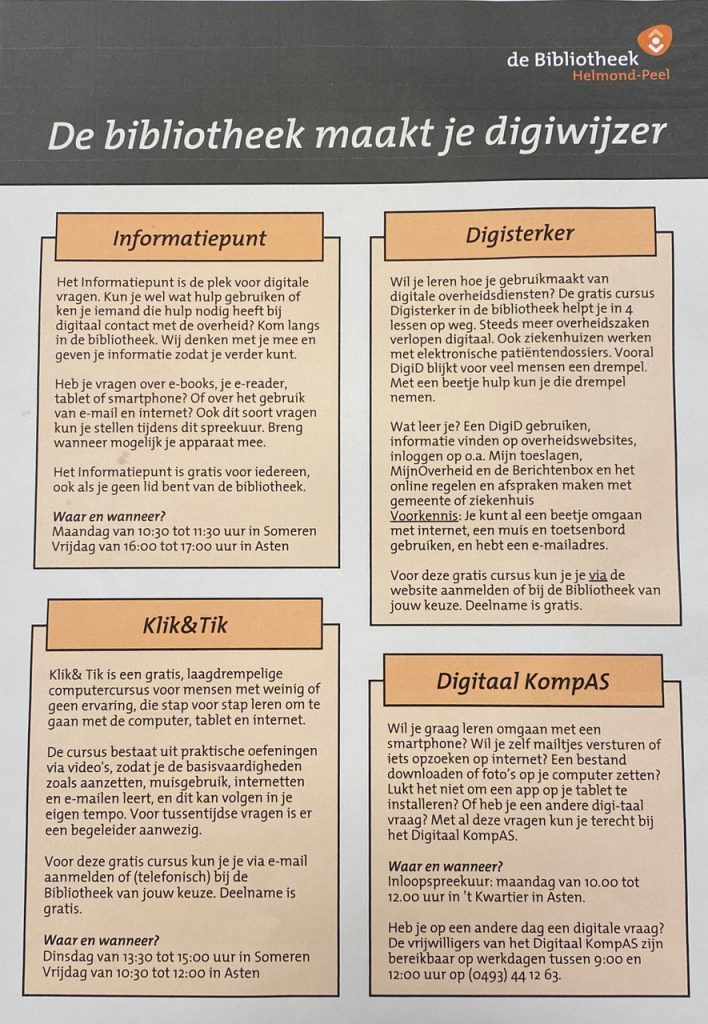 De middag werd gestart door Roos Weijers van bibliotheek Someren. Zij gaf een lezing over met welke digitale vragen je allemaal naar de bibliotheek kunt gaan. Voor zowel digitale spreekuren als computercursussen kun je terecht in de bibliotheek, zie de flyer onder dit bericjht of https://www.bibliotheekhelmondpeel.nl/Leren_Oefenen/digitaal-meedoen.html.