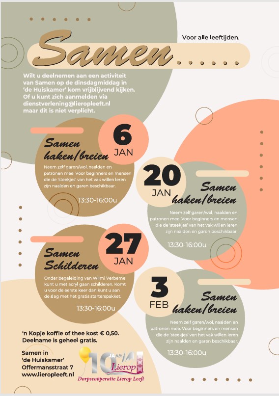 Tijdens het ‘Samen oliebollen eten’ op 30 december werd het al aangekondigd: De werkgroep Dienstverlening & Communicatie gaat in het nieuwe jaar gewoon door met de ‘Samen . . . activiteiten’. Op de poster hiernaast kunt u zien wat er in de maand januari op het programma staat.